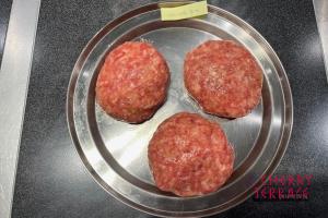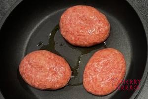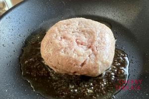 - クリステルフライパンにラウデミオをひき、火をつける前にハンバーグを並べる(コールドスタート)。中弱火で4〜5分じっくり焼く。
