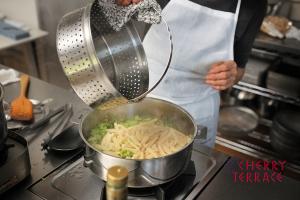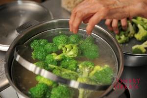 - クリステル深鍋にバスケットをセットし、塩(適量)を加えた湯でカサレッチェを茹でる。一緒にブロッコリーを茹でる。※カサレッチェはアルデンテではなくしっかり茹でる。