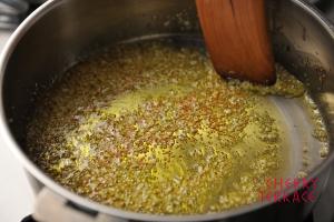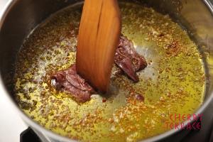 - 香りが出てきたら火を止め、鷹の爪、アンチョビを加える。アンチョビは木べらでつぶしておく。