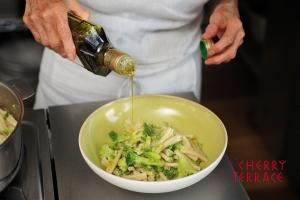 パスタ・ティレーナの「カサレッチェ」を使った一品です。ポイントは、パスタとブロッコリーを一緒にゆでること。クリステル浅鍋にオリーブオイルを熱し、にんにく、鷹の爪、アンチョビを加えておき、ゆだってきたブロッコリーを少しずつ移して木べらでつぶしていきます。一度に移さないことで、ちょっとずつ硬さや食感の異なるブロッコリーを味わうことができ、これがまたおいしさに繋がります。