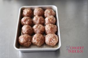 • まずミートボールを作り、ソースで煮込んでおく。ボウルに合挽肉、パン粉、薄力粉、ナツメグパウダー2つまみ(できればナツメグの実をすりおろす)、塩、卵を加えて全体が馴染むまで練り合わせる。全体量を計り、10等分に分けて丸める。