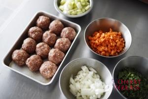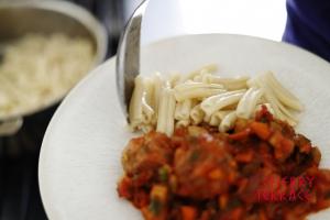 野菜たっぷりのトマトソースでミートボールを煮込み、カサレッチェににんにくを軽く漬け込んだオイルで風味つけして盛り合わせます。ひき肉の粗さが素朴な食感に仕上がって美味しいですよ。カサレッチェの他、ペンネやフジッリでも。