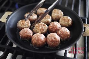 • クリステルフライパンに植物油を温め、1のミートボールを並べ入れる。蓋をし、弱めの中火で2、3分蒸し焼きする。蓋を取って下側に焼き目がついていたら上下を返し、同様に焼いて取り出しておく。