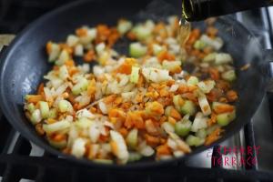 • 2のフライパンにセロリの葉以外の野菜を全部入れ、ドライタイムを加えて混ぜながら炒める。途中で塩、ラウデミオを加えて混ぜる。
