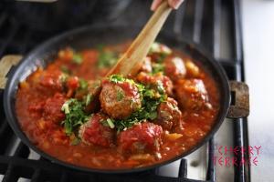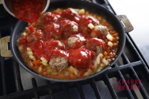 • 次にミートボールを加え、白ワインと水50ml、トマトピュレを加えてそっと混ぜる。