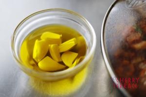 • にんにくの皮をむき、4等分くらいに切り分けて芯をとって、ラウデミオ100mlに浸けておく。