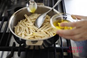 • クリステル浅鍋22cmに700mlほどの水を入れて煮立て、カサレッチェを茹でる。途中軽めに塩を振り、9分を目安に茹でる。茹で上がりにガーリックオイルを大さじ2くらい回しかけて混ぜる。