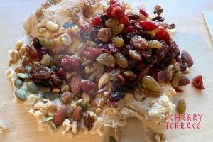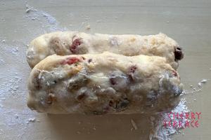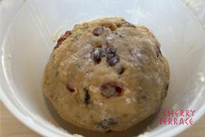 - 4をこね、台に取り出し、マーマレード、ラム酒漬けのドライフルーツ、ナッツを混ぜ、均等に混ざるようにこねる。*べたつく場合は生地表面に粉を少し足しながらこねると作業が楽になります。