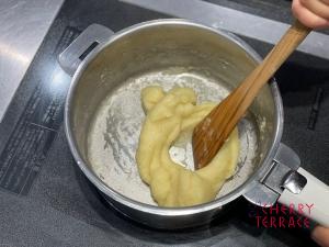 - シュー生地を作る。クリステル深鍋20cmにバター、グラニュー糖、塩、水を入れ、弱火にかける。バターが溶けたら、火から下ろして薄力粉を一気に加え、木べらで手早く混ぜる。再び火にかけ、生地がまとまって鍋底にくっつかなくなるまで混ぜ、火から下ろし、スライシーに移す。