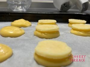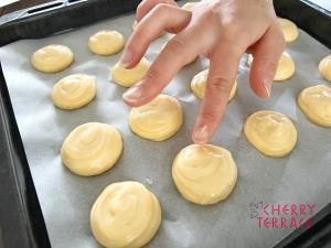 - 3を絞り袋に入れ、オーブンシートを敷いた天板に直径約4cmに丸く絞りだす。指先に少量の水をつけ、生地の先のとがったところの押さえ、形を整える。