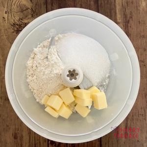 - クッキー生地を作る。バーミックス(スライシー/チョッピングナイフ)に全ての材料を入れ、混ぜ合わせる。オーブンペーパーで生地をはさみ2mmの厚さに伸ばし、冷凍庫で休ませる。クッキー生地を休ませた後、型から抜いて再度冷凍庫に入れておく。