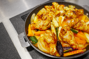 - 野菜がしんなりしてきたらトマト缶、コンソメを加える。2の手羽元を戻しふたをして肉に火が通るまで火にかける。