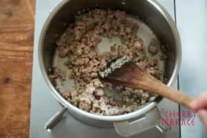 • クリステル深鍋18cmラウデミオをひき、玉ねぎ、にんにくを弱火で香りが出るまで炒める。香りが出たら豚肉を加え1分ほど中火で炒める。全体に色が変わったら、水を加え強火で煮立たせあくを除く。