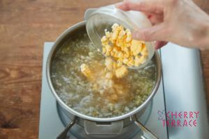 • 2に米ととうもろこしを加えふたをし、弱めの中火から弱火で20分ほど時々混ぜながら煮込む。