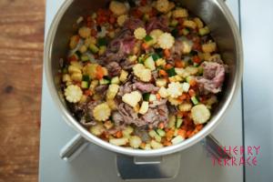 - クリステル深鍋18cmにラウデミオを加え中火で熱し、にんじんとズッキーニ、牛肉、ヤングコーンを加えしんなりするまで2分ほど炒める。