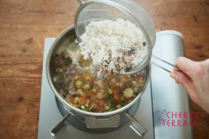 - 水を加え沸騰したら水気を切った米を加え煮立たせる。