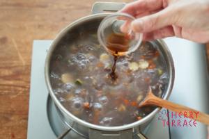 - ふたをし、20分ほど弱めの中火から弱火で時々混ぜながら煮込む。ナンプラーとにんにくのすりおろしで味を調える。
