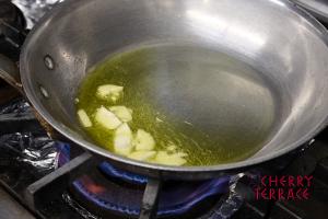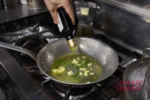 - フライパンにラウデミオをひき、火にかける。パチパチ音がしてきたらにんにくを炒める。ラウデミオを足す。