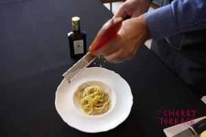 - 皿に盛り付け、ボッタルガ、レモンの皮を削りかけてラウデミオをまわしかけたら完成。