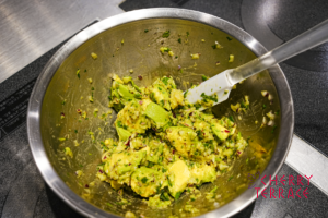 - アボカドは皮をむき、種を取り、1口大に切る。