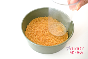 - バーミックス(スライシー/チョッピングナイフ)でグラハムクッキーを砕く。細かくなったら、溶かしバターを加えひと回しし、型の側面に敷きこむ。※平らな器の底で押すように敷き詰めると簡単です。