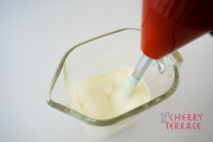- 水でふやかした粉ゼラチンをレンジまたは湯煎で溶かし、2に加え混ぜる。