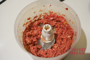 • 2のバーミックス(スライシー/チョッピングナイフ)に肉を入れ、挽き肉にする。
