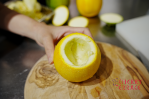 • 丸ズッキーニはヘタの部分1㎝ほどを切り、ふたにする。スプーンで中身をくりぬく。