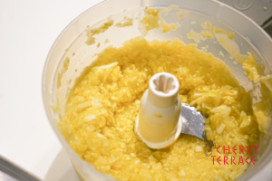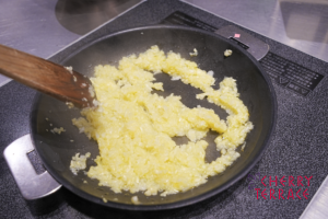 • バーミックス(スライシー/チョッピングナイフ)に玉ねぎ・にんにく、1でくりぬいたズッキーニの中身を入れ、みじん切りにする。
