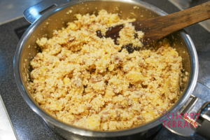 - 肉に火が通ったらおからとじゃがいもを加える。じゃがいもをヘラでつぶしながら混ぜ合わせる。