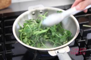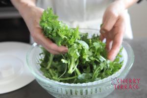 • 春菊、香菜、三つ葉は食べやすい長さに切り、サラダスピナーでしっかりと水切りをする。