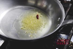 - フライパンにオリーブオイル、にんにく、鷹の爪を入れ弱火にかけ、にんにくに色がつくまで炒める。