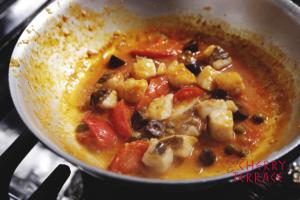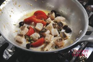 - カサゴ、黒オリーブ、ケッパー、フルーツトマトを加え炒める。