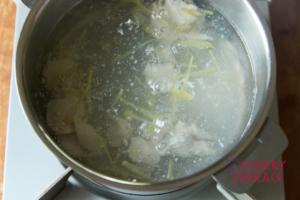 • クリステル深鍋18cmに水とささみ、しょうがを加え沸騰したらアクを除く。