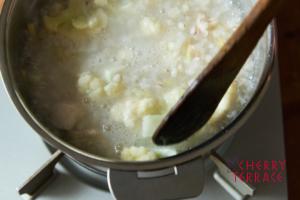 • 米とハトムギを加えふたをし、中火で15分ほど煮込む。時々底から混ぜ、15分したらカリフラワーと塩も加える。