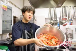 - パスタをソースに入れ、最後にバジルの葉を手でちぎって加える(バジルの香りが漂う)。