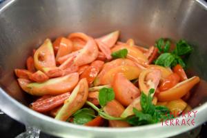 - トマトを加え、蓋をして中火で4分くらい加熱する。トマトが柔らかくなったら、木べらでつぶす(ラウデミオにトマトの味が広がり、ソースが完成する)。