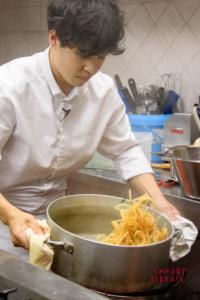 - 水2ℓに対して塩30gを加え、スパゲッティを13分茹でる。※沸騰させず、90度くらいの湯で泳がせるように茹でるのでも良い。