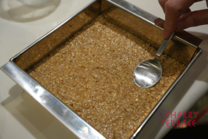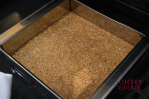 - 1のクラストの上に2のフィリングを流し表面を平らにする。冷凍庫に入れ一晩おく。