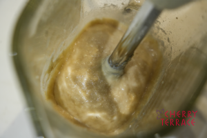 - 縦長の容器に水を切ったカシューナッツ、メイプル、ココナッツミルク、レモン汁を加え、バーミックス(ミンサー)でナッツを砕くようにつぶし混ぜる。