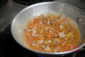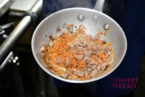- フライパンに油をひき、豚肉、にんじんを軽く焼き色が付くまで炒める。