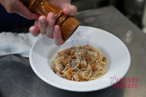- 3に加え、仕上げに黒こしょう(多め)、パルミジャーノ、ラウデミオとかける。
