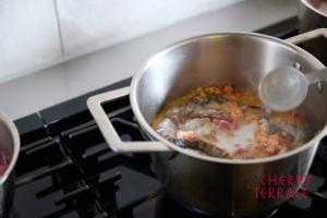 • 1826collectionソースパン16cmにバターとラウデミオ大さじ1/2をいれて弱火で溶かし、カルダモン、クローブ、コリアンダーシード、クミンシード、マスタードシード、赤唐辛子を加え良い香りがでるまでテンパリングし、5に加えて混ぜる。