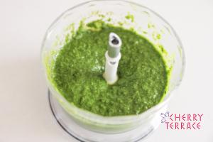- 1に葉をつまんだバジルとAを加えてなめらかになるまで撹拌する。
