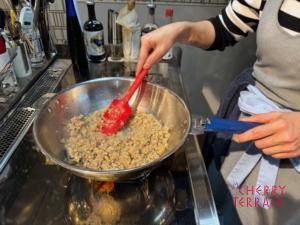 - クリステル中華鍋28cmにラウデミオを熱し、玉ねぎ、ひき肉の順に炒める。