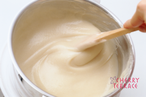 • 水でぬらした流し缶に流し入れ、ぬらしたキッチンペーパーをはりつけ、水少々を注いでラップをかけ、常温で冷やしかためる。